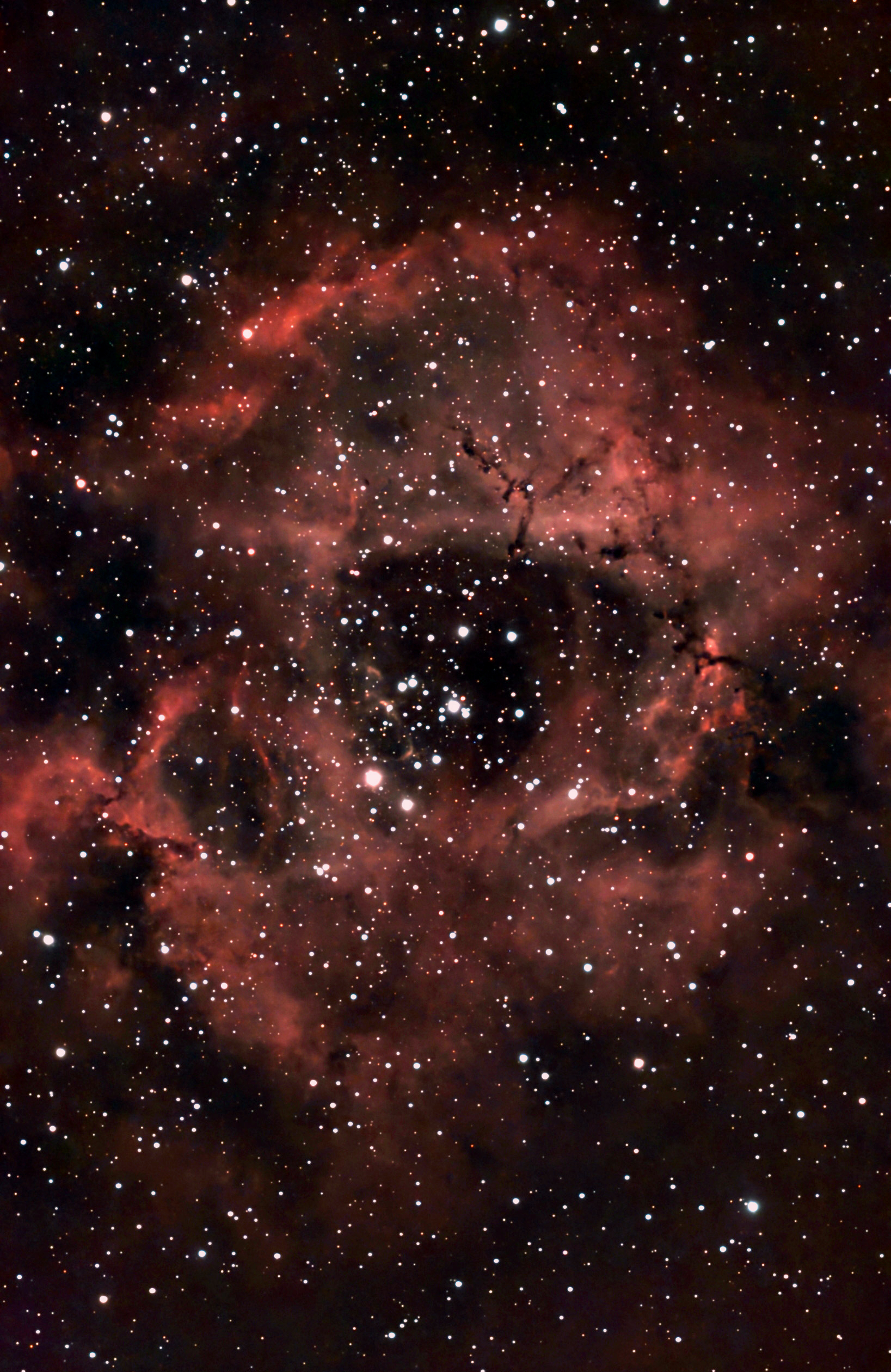 Skywatcher 200PDS 200 mm, f/5 Newtonian on NEQ6 mount with Canon 60Da camera. Five 360 s exposures at ISO 400. Note the so-called Christmas Tree Cluster in the middle of the nebula.