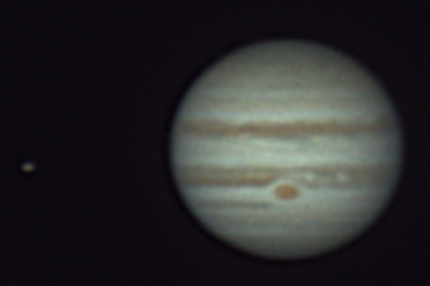 The first of many images of Jupiter taken during the evening! Io is visible in the full frame (not the thumbnail) to the left of the planet. Meade 200 mm LX200 with Atik Titan camera at 15 FPS. Stacking with Autostakkert!, wavelet processing in Registax 6 and final editing in Photoshop Elements 11.