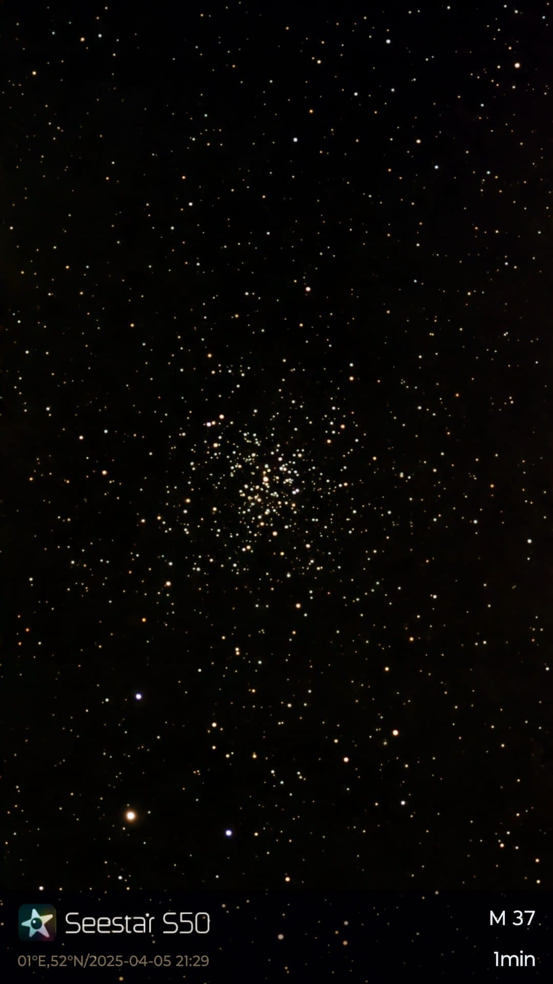 Seestar S50 "smart" telescope. Six 10 s frames. The cluster is sometimes referred to as the "37 cluster" because of the striking resemblance of the main stars to the number 37.