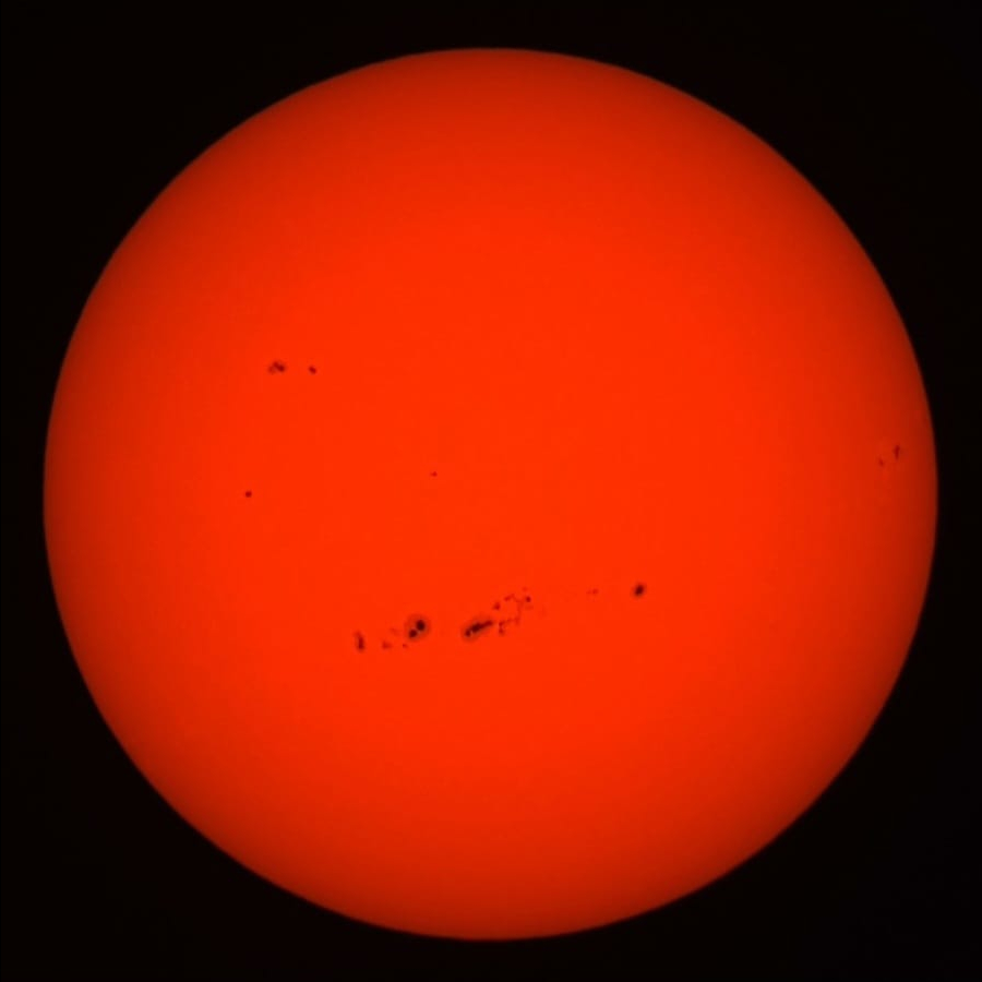 OASI's Widesky 80 mm F/6.25 APO refractor with a lunt Herschel wedge. Afocal image taken with a smartphone. The large sunspots N of the solar equator approaching the western limb are, in order L -> R: AR4143 (letftmost two), AR4136, AR4146 and AR4139.